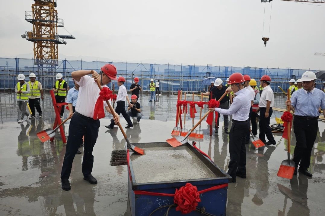 ▲ 浦江縣縣委常委、副縣長鄭燎原,眾合科技執行總裁、海納股份董事長何昊共同澆筑了浦江項目主體廠房結構最后一塊混凝土的第一鍬