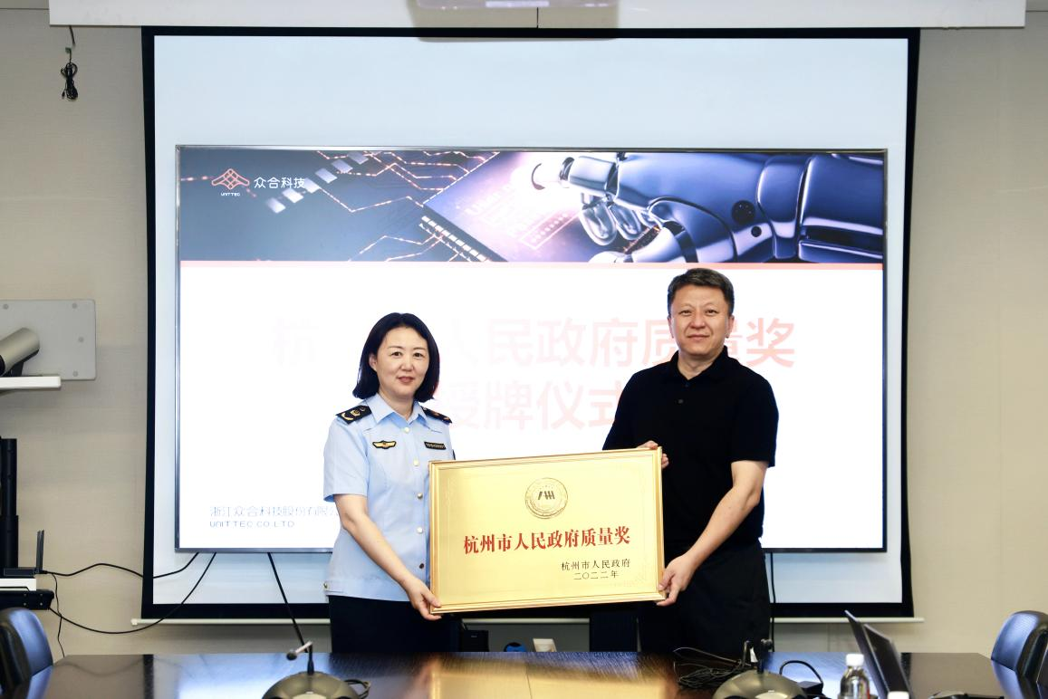 6月19日,高新區(濱江)市場監管局黨委書記、局長史瓊帶隊走訪調研眾合科技,為公司頒發“杭州市人民政府質量獎”獎牌和證書。眾合科技總裁邊勁飛、職能副總裁鄭曉亞、首席質量官章鳳琴熱情接待。