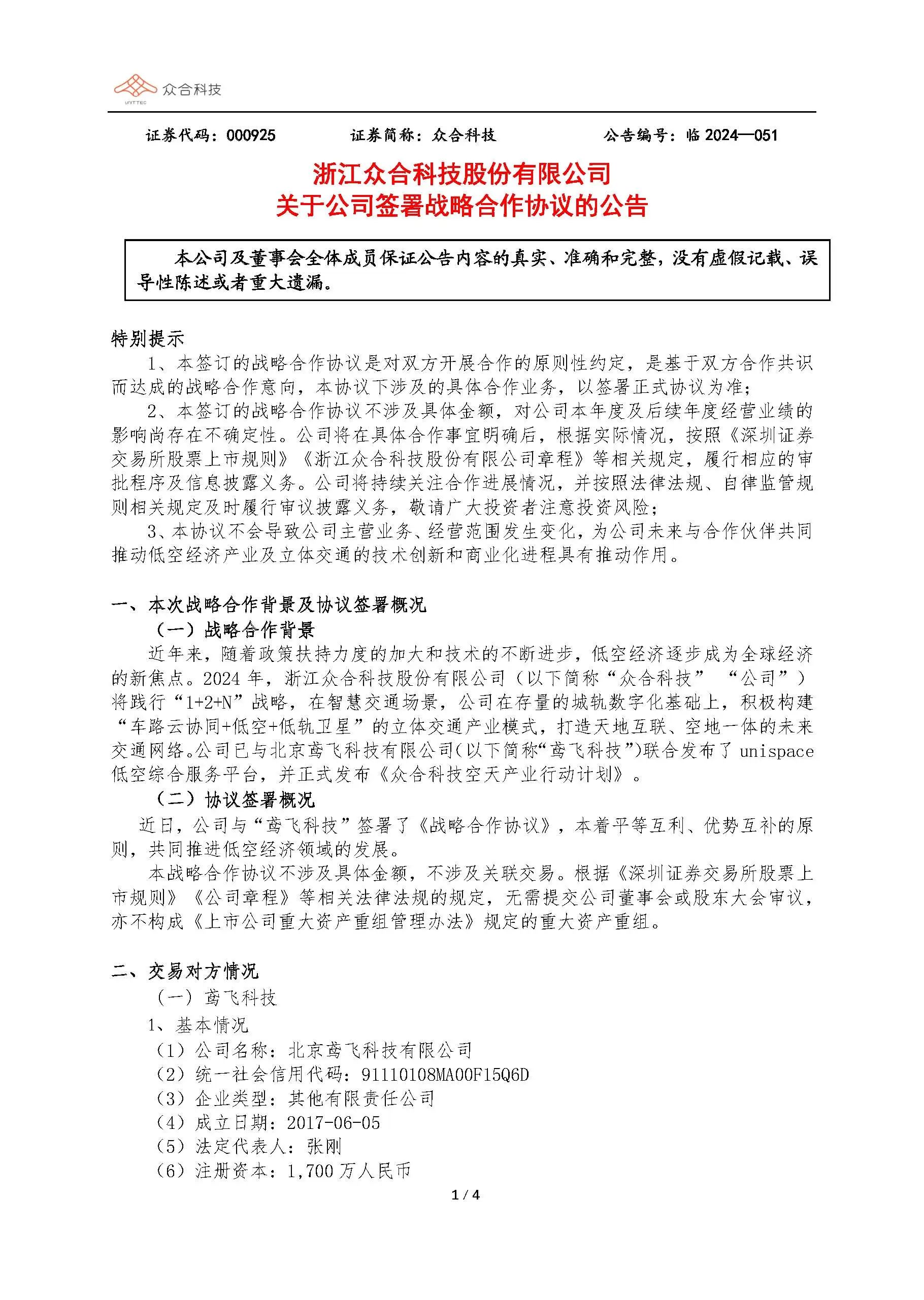 6月27日,眾合科技發布公告稱,與北京鳶飛科技有限公司(以下簡稱“鳶飛科技”)正式簽署了戰略合作協議。根據協議,雙方將展開多方位深度合作,涵蓋技術、股權、應用場景和渠道資源等多個關鍵領域,共同推動低空經濟領域的創新與發展,實現資源共享、優勢互補、互利共贏。