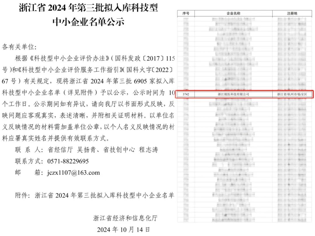 近日,浙江省經濟和信息化廳印發《浙江省科技廳關于2024年第三批擬入庫科技型中小企業名單的公示》。眾合科技旗下浙江煋醫科技有限公司被認定為“國家科技型中小企業”,并被納入2024年第三批國家科技型中小企業信息庫。