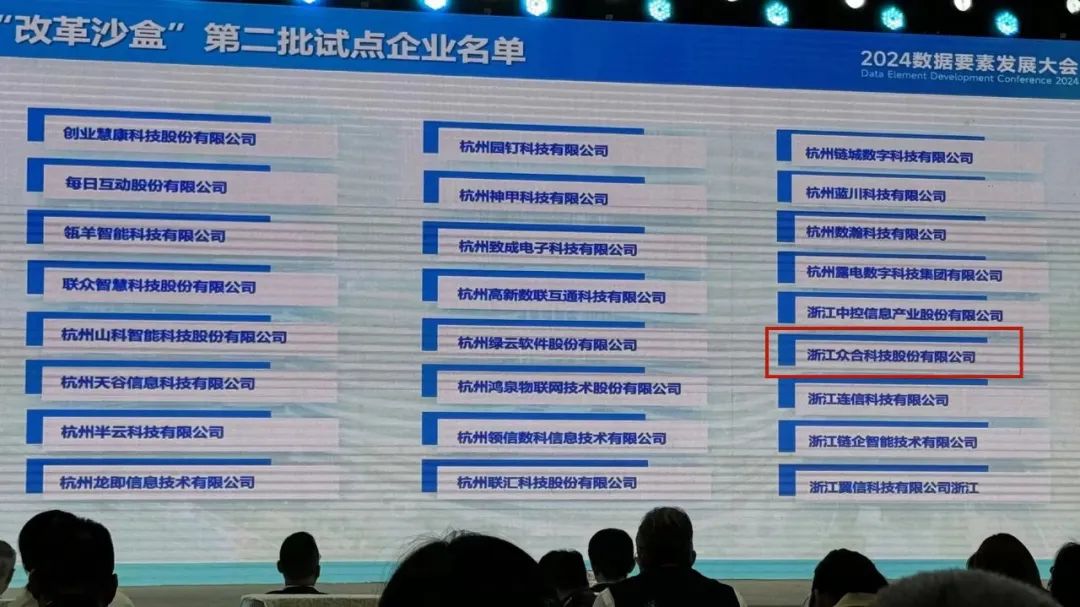 近日,以“激發數據要素新價值 加快形成新質生產力”為主題的2024數據要素發展大會在“中國數谷”核心區舉行,國家數據局、國家發改委、省司法廳、省經信廳、省數據局、市政府、市數據資源局、市發改委及濱江區的一眾領導出席大會。大會公布了“中國數谷”數據要素“改革沙盒”的第二批試點企業名單,浙江眾合科技股份有限公司憑借在大數據管理和數據服務領域的卓越表現成功入選。
