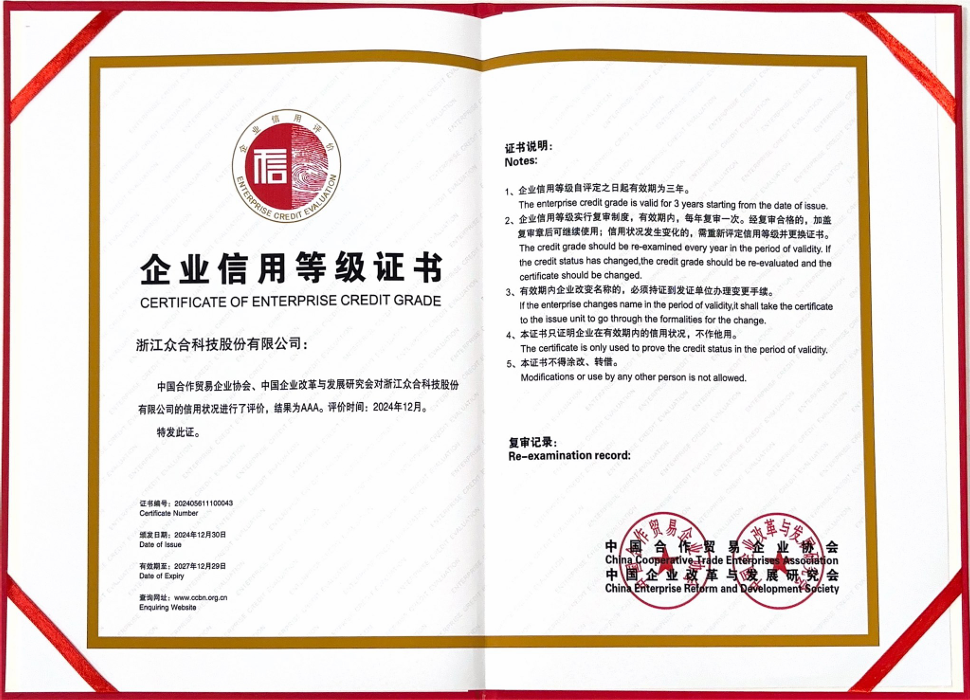 在新一輪科技革命與產(chǎn)業(yè)變革浪潮中,誠信經(jīng)營是企業(yè)長久生存與發(fā)展的根基,亦是立于不敗之地的核心。長久以來,眾合科技始終嚴(yán)格履約踐諾,將誠信理念貫穿在營銷、管理、生產(chǎn)等各個環(huán)節(jié),憑借健全的信用管理體系、優(yōu)良的合同履約信用狀況和良好的市場信譽(yù),榮獲了“2023年浙江省AAA級守合同重信用企業(yè)”等榮譽(yù),展現(xiàn)了公司在推動行業(yè)信用體系建設(shè)中的卓越表現(xiàn)。